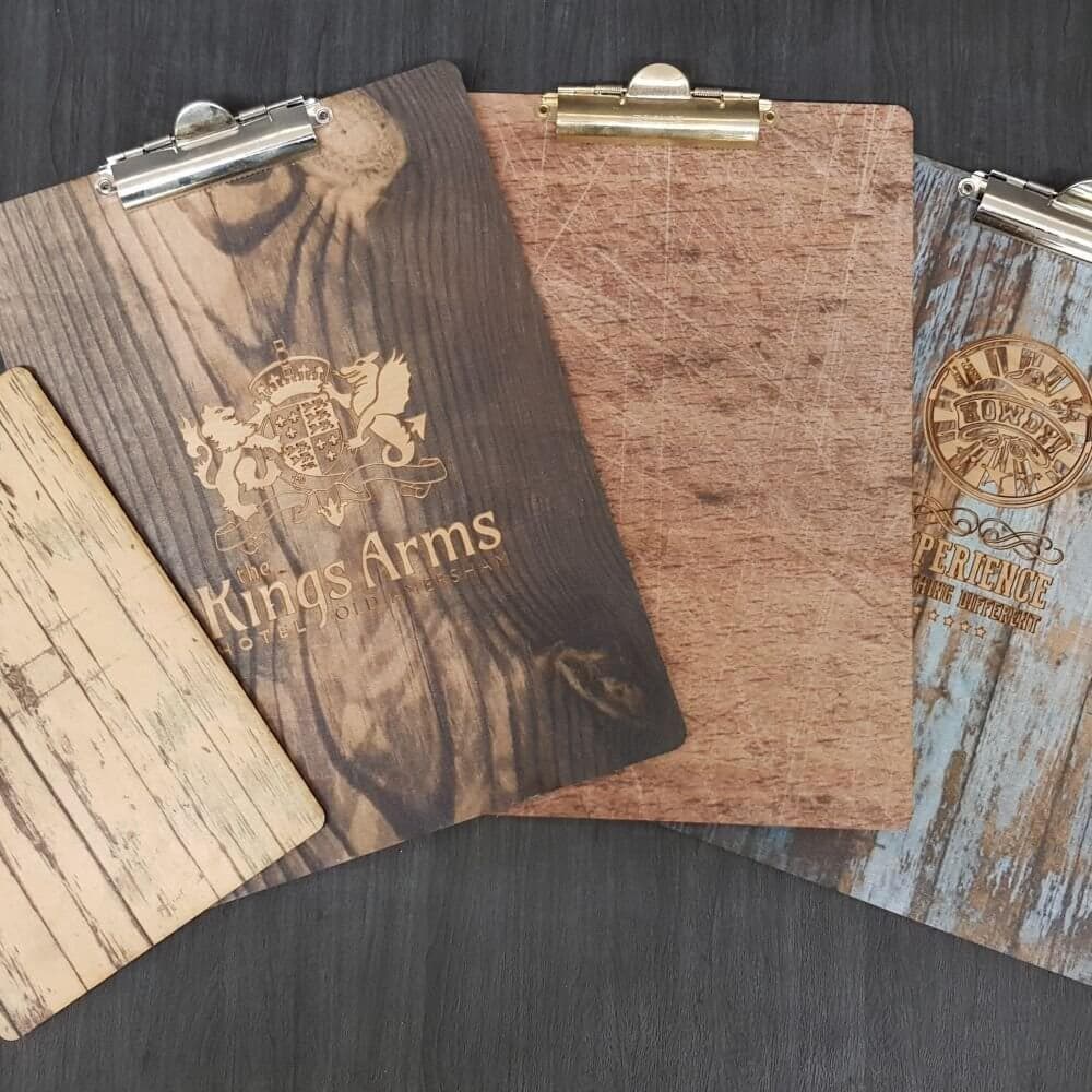Our wooden menu boards are manufactured in four rustic plywood timber finishes and finished with a silver clip and available in 1/2 A4, A4 and A5 size. Please note this is a natural product and therefore may have a slight colour difference to the image shown. Printing & engraving is available of required, please add your wording or upload your artwork when ordering.