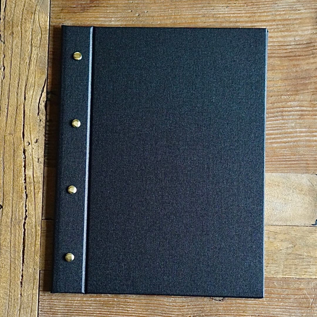 We have small quantities of these Black Buckram A4 Menu Covers with screw fixing, on the shelf, ready to be finished with corners or branding. Available within 7 working days without branding or slightly longer if you require them to be branded to your design.